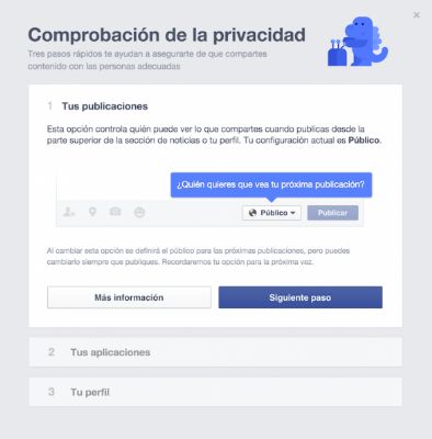 Comprobación de la Privacidad, es una nueva funcionalidad que ayuda al usuario a revisar su configuración de la privacidad fácilmente. Podríamos definirlo como una especia de acceso directo bastante útil. Lo primero que veremos es que Facebook enseñará al iniciar sesión una opción para que podamos comprobar si estamos utilizando la red social tal y como queremos.